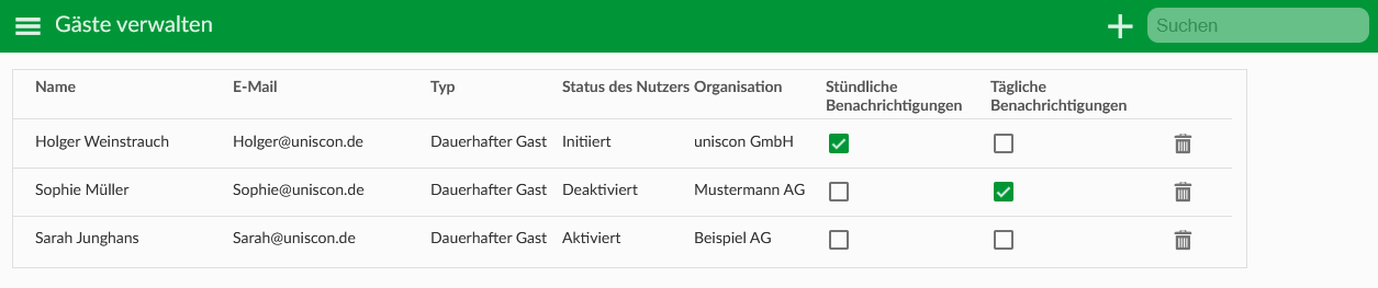 Sie löschen einen Gast über den Papierkorb in dessen Zeile.