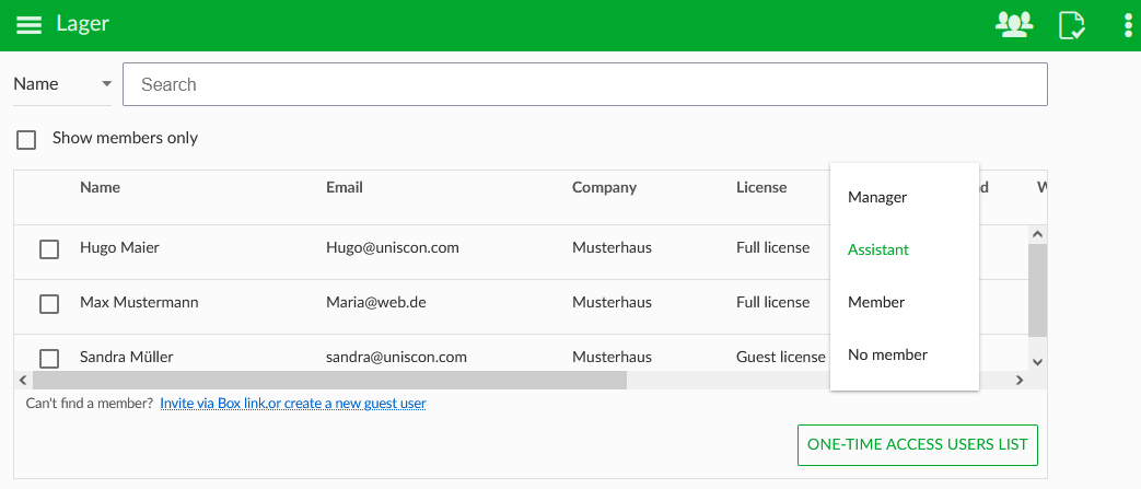 Besides the permissions like read, write, delete, the members can be assigned roles. There is the role of owner, manager, member, assistant. Proceed as follows: Open the box by clicking on the name of the box. Click the 3-dot menu in the toolbar at ...